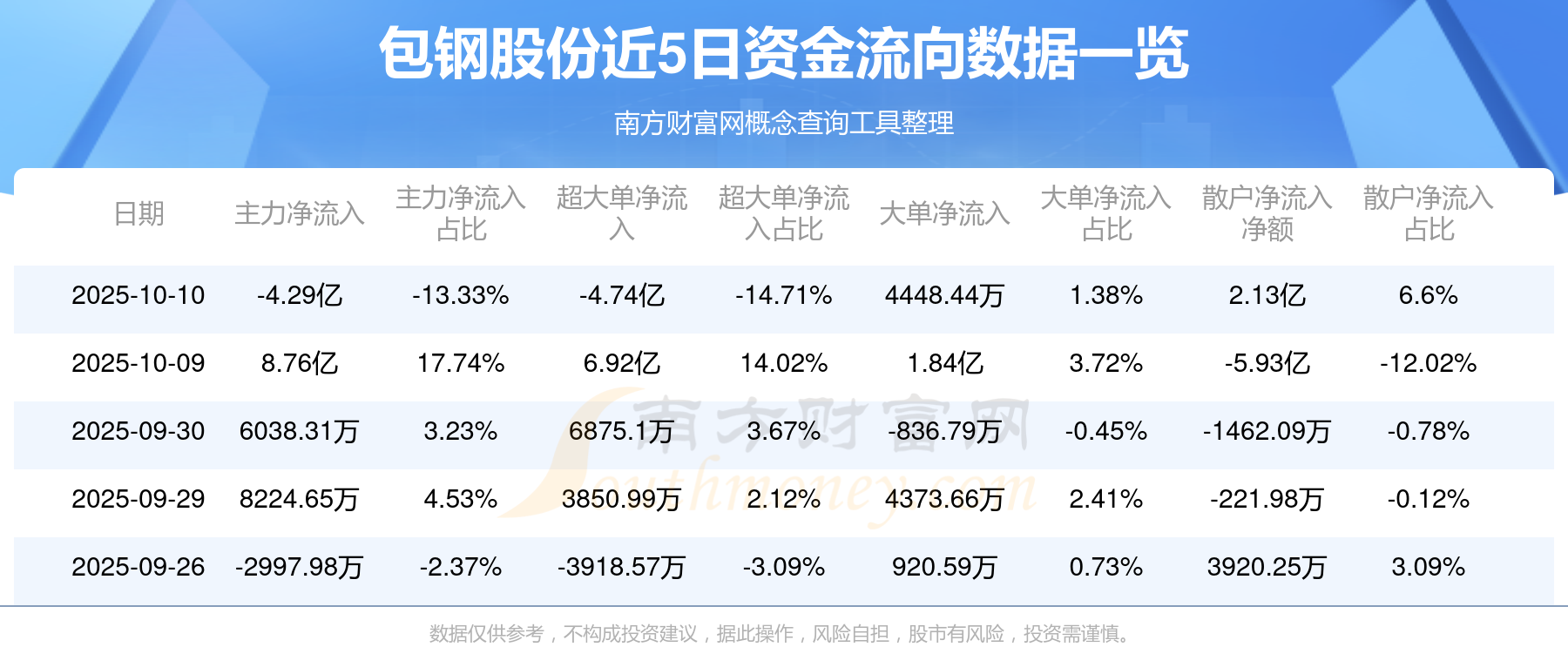 10月10日消息,包鋼股份主力資金凈流出4.29億元,超大單資金凈流出4.74億元,散戶資金凈流入2.13億元。