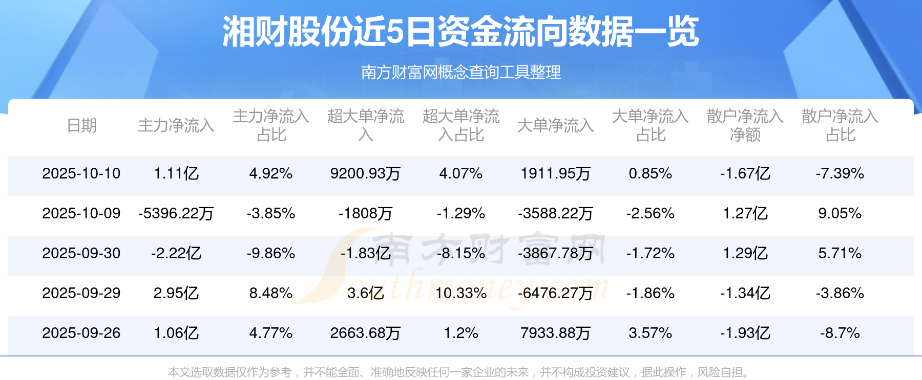10月10日消息,湘財(cái)股份資金凈流入1.11億元,超大單資金凈流入9200.93萬元,換手率5.79%,成交金額22.32億元。