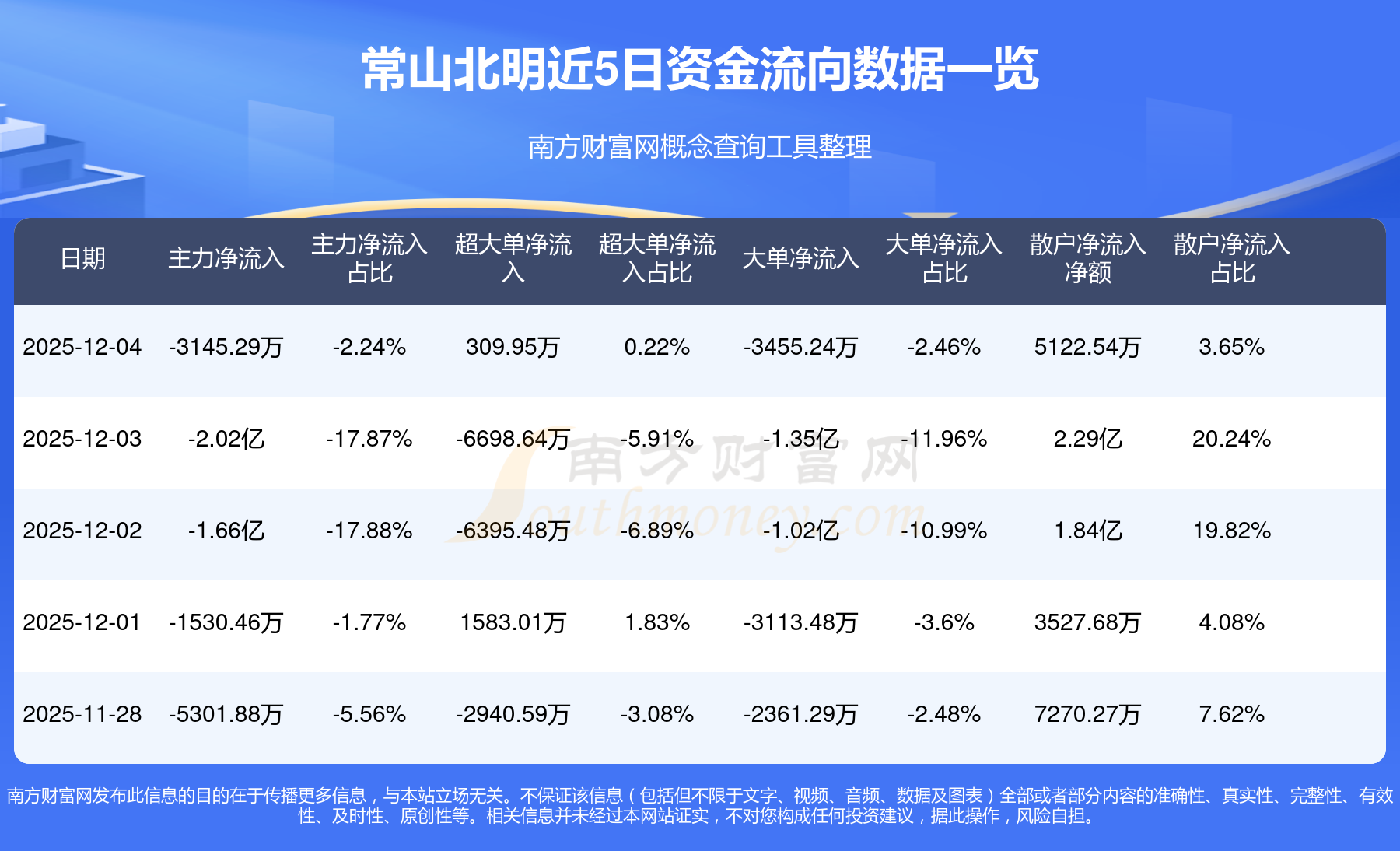 12月4日消息,常山北明主力凈流出3145.29萬(wàn)元,超大單凈流入309.95萬(wàn)元,散戶凈流入5122.54萬(wàn)元。