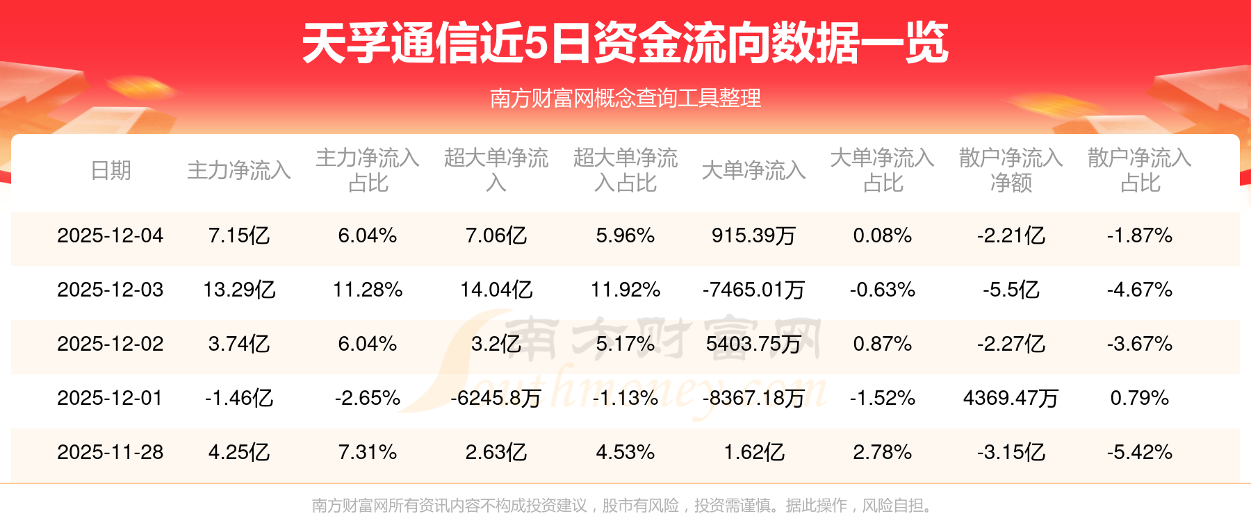 12月4日消息,天孚通信主力資金凈流入7.15億元,超大單資金凈流入7.06億元,散戶資金凈流出2.21億元。