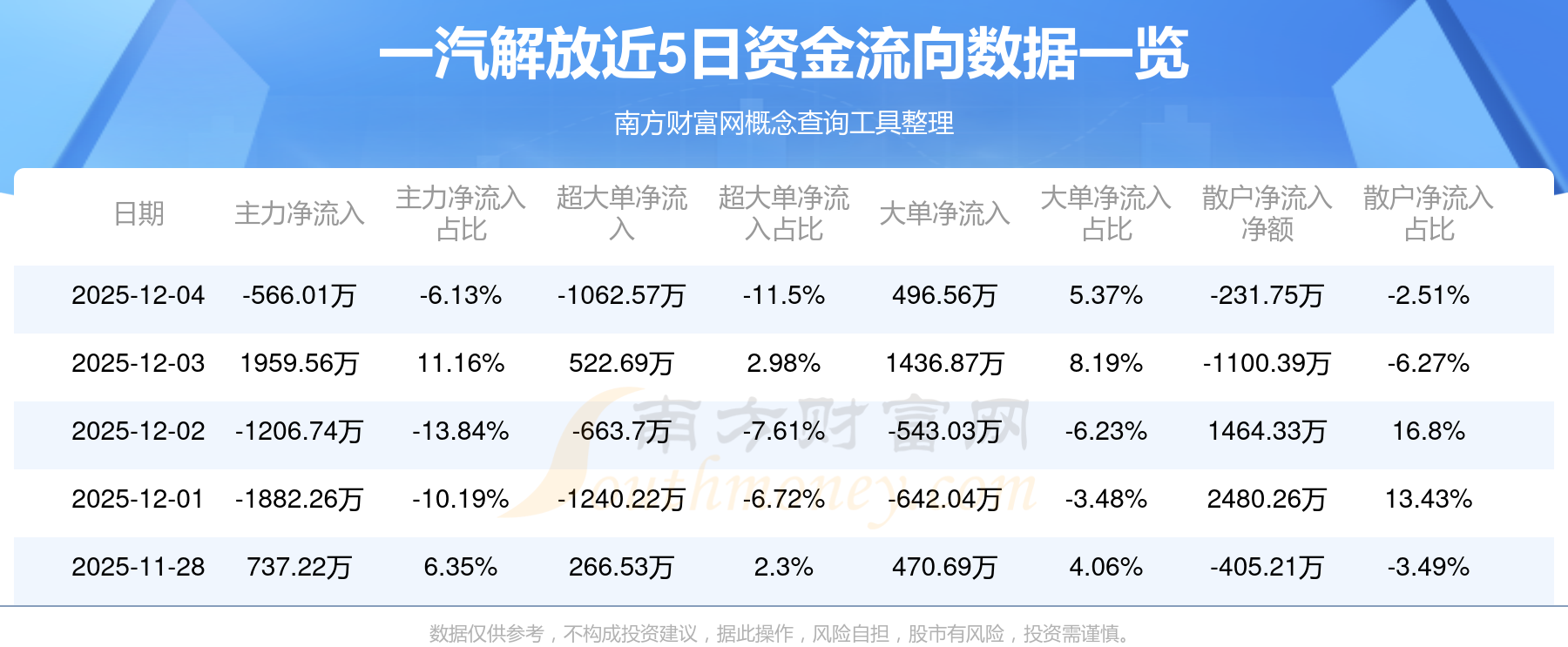 12月4日消息,一汽解放主力凈流出566.01萬元,超大單凈流出1062.57萬元,散戶凈流出231.75萬元。