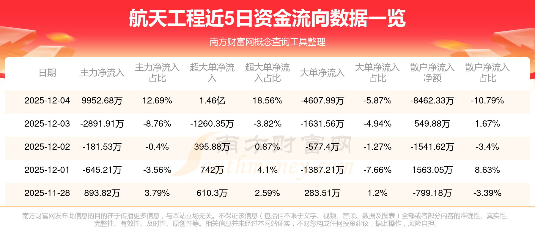 12月4日消息,航天工程12月4日主力凈流入9952.68萬元,超大單凈流入1.46億元,大單凈流出4607.99萬元,散戶凈流出8462.33萬元。