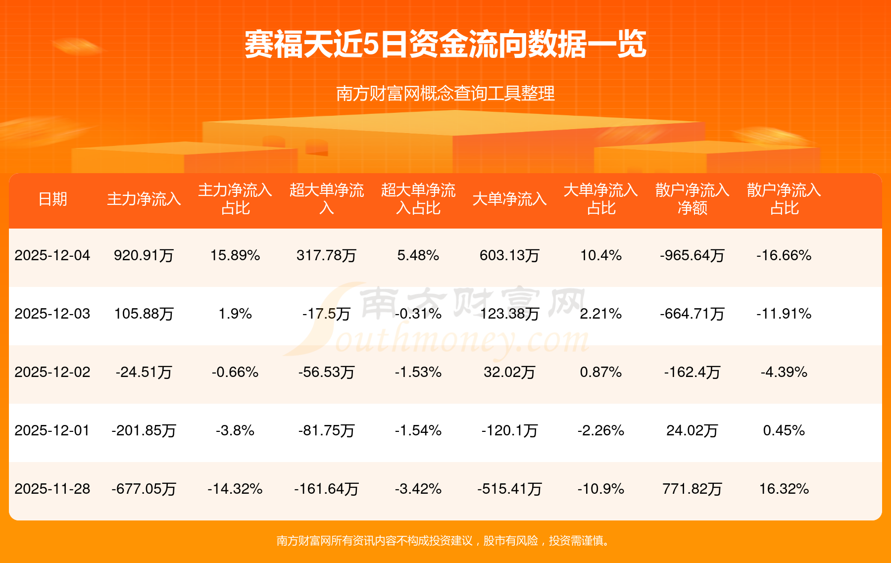 12月4日消息,賽福天主力凈流入920.91萬元,超大單凈流入317.78萬元,散戶凈流出965.64萬元。