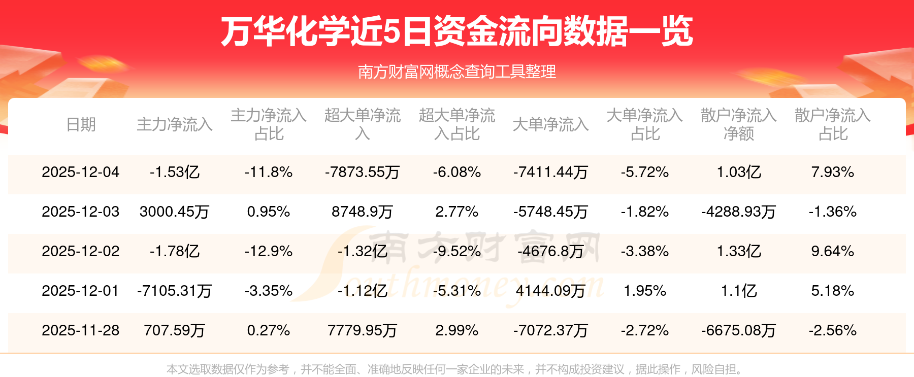 12月4日消息,萬華化學(xué)資金凈流出1.53億元,超大單凈流出7873.55萬元,換手率0.61%,成交金額12.95億元。