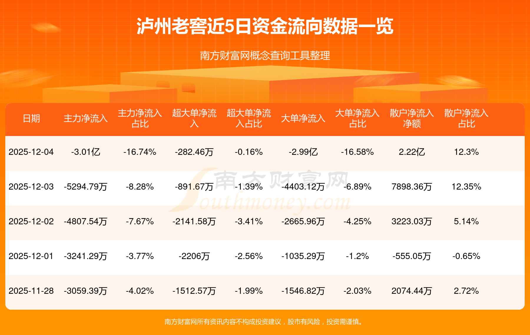 12月4日消息,瀘州老窖12月4日主力資金凈流出3.01億元,超大單資金凈流出282.46萬(wàn)元,大單資金凈流出2.99億元,散戶資金凈流入2.22億元。