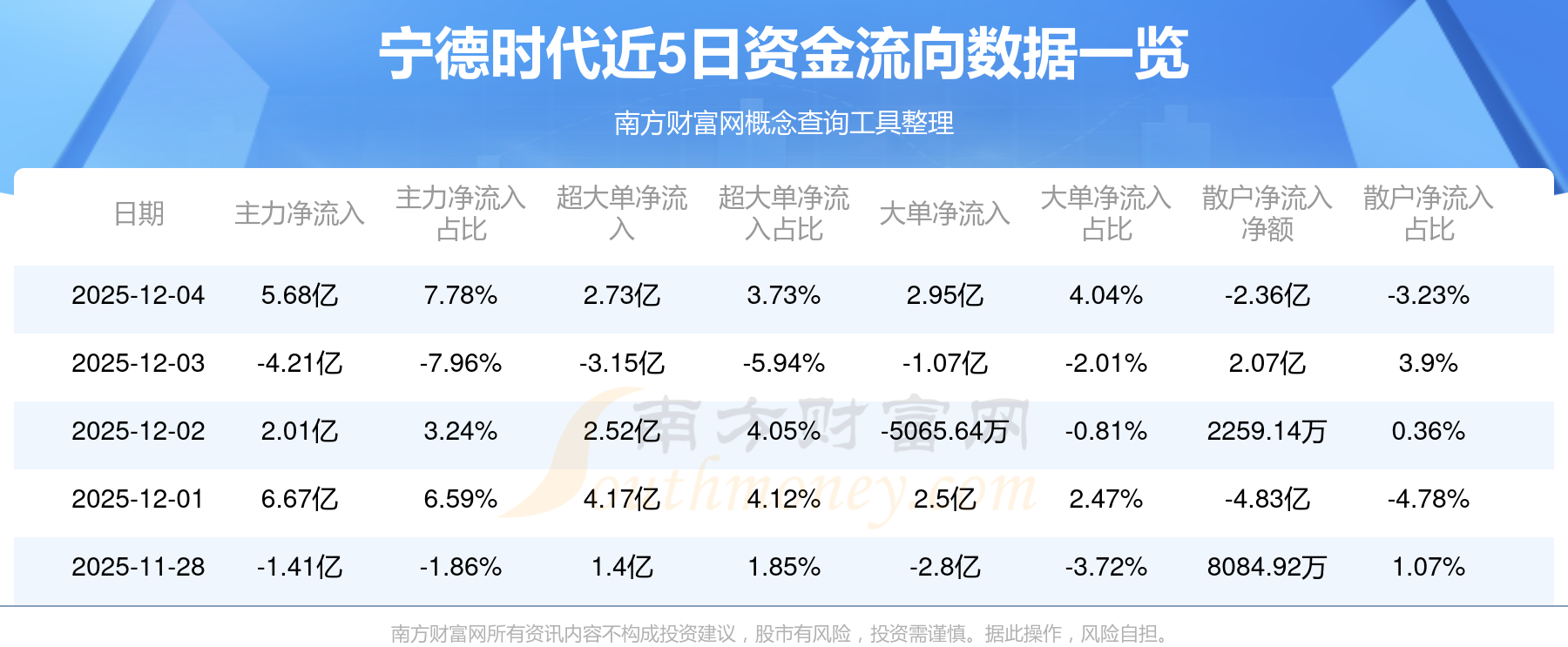 12月4日消息,寧德時代主力凈流入5.68億元,超大單凈流入2.73億元,散戶凈流出2.36億元。