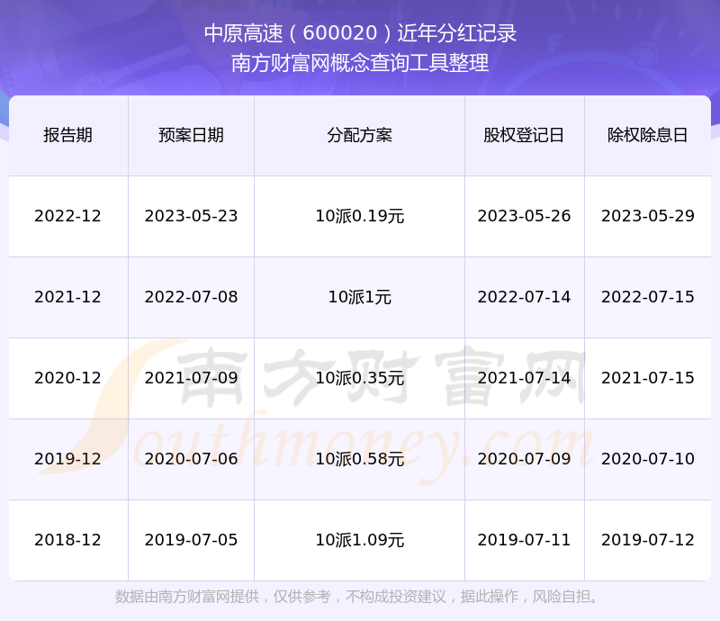 中原高速最新一次公布的分紅方案:10派0.19元。