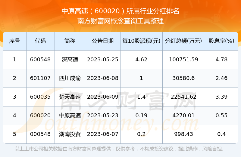 按照南方財富網(wǎng)趨勢選股系統(tǒng)統(tǒng)計,中原高速所屬行業(yè)為鐵路公路行業(yè),鐵路公路行業(yè)分紅排名情況如下表:
