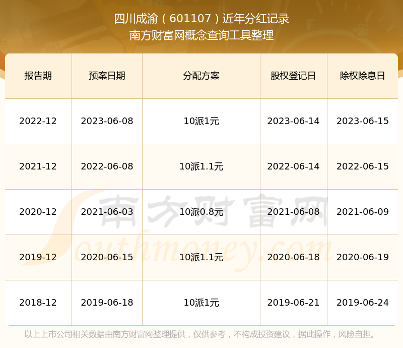 四川成渝最新一次公布的分紅方案為10派1元。本次權(quán)益分派股權(quán)登記日為2023年6月14日,除權(quán)除息日為2023年6月15日,派息日為2023年6月15日。