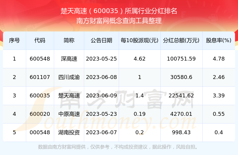 按照南方財(cái)富網(wǎng)趨勢(shì)選股系統(tǒng)統(tǒng)計(jì),楚天高速所屬行業(yè)為鐵路公路行業(yè),鐵路公路行業(yè)分紅排名情況如下表: