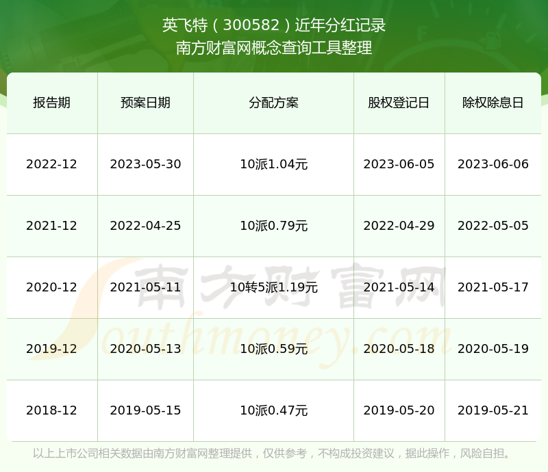 英飛特最新一次公布的分紅方案:10派1.04元。