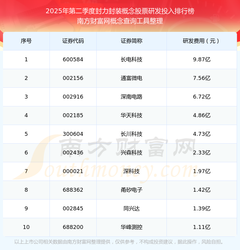 2025年第二季度,封力封裝概念股票研發(fā)投入排行榜中,長電科技(600584)研發(fā)投入總額高達(dá)9.87億,通富微電(002156)和深南電路(002916)位居第二和第三,華天科技(002185)、長川科技(300604)、興森科技(002436)、深科技(000021)、甬矽電子(688362)、同興達(dá)(002845)、華峰測控(688200)進(jìn)入前十,研發(fā)投入總額分別排名第4-10名。