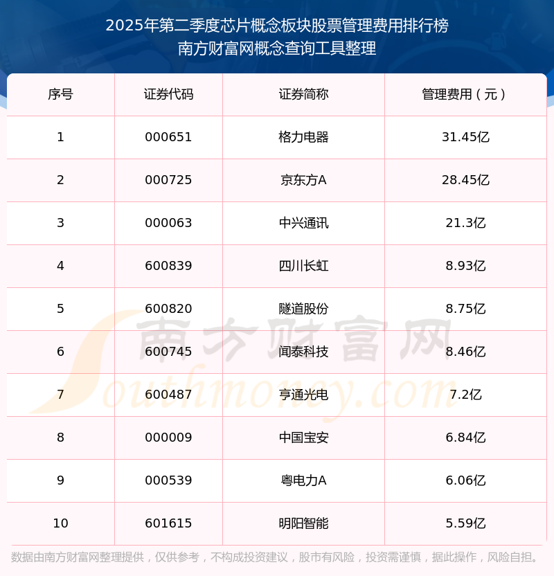 2025年第二季度,芯片概念板塊股票管理費用排名中,格力電器(000651)的管理費用總額高達(dá)31.45億,京東方A(000725)和中興通訊(000063)排名第二和第三,四川長虹(600839)、隧道股份(600820)、聞泰科技(600745)、亨通光電(600487)、中國寶安(000009)、粵電力A(000539)、明陽智能(601615)進(jìn)入前十,其管理費用總額分別排名第4-10名。