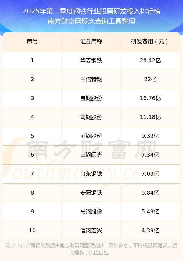 2025年第二季度鋼鐵行業(yè)股票研發(fā)投入排行榜如下:華菱鋼鐵(000932)研發(fā)投入總額高達28.42億,中信特鋼(000708)和寶鋼股份(600019)分別位居第二和第三,南鋼股份(600282)、河鋼股份(000709)、三鋼閩光(002110)、山東鋼鐵(600022)、安陽鋼鐵(600569)、馬鋼股份(600808)、酒鋼宏興(600307)分別進入前十,其研發(fā)投入總額分別排名第4-10名。