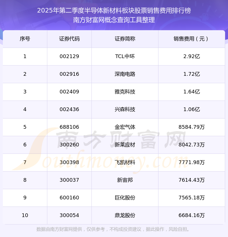2025年第二季度,半導(dǎo)體新材料板塊股票銷售費(fèi)用排行榜如下:TCL中環(huán)(002129)的銷售費(fèi)用總額高達(dá)2.92億,深南電路(002916)和雅克科技(002409)分別位居第二和第三,興森科技(002436)、金宏氣體(688106)、新萊應(yīng)材(300260)、飛凱材料(300398)、新宙邦(300037)、巨化股份(600160)、鼎龍股份(300054)分別進(jìn)入前十,其銷售費(fèi)用總額分別排名第4-10名。