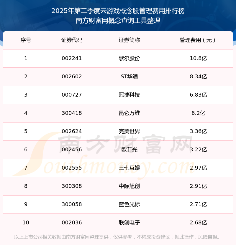 2025年第二季度,云游戲概念股管理費(fèi)用排行榜如下:歌爾股份(002241)的管理費(fèi)用總額高達(dá)10.8億,ST華通(002602)和冠捷科技(000727)分別排名第二和第三,昆侖萬維(300418)、完美世界(002624)、歐菲光(002456)、三七互娛(002555)、中際旭創(chuàng)(300308)、藍(lán)色光標(biāo)(300058)、聯(lián)創(chuàng)電子(002036)分別進(jìn)入前十,其管理費(fèi)用總額分別排名第4-10名。