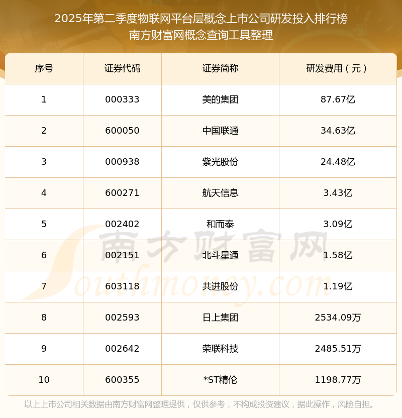 2025年第二季度物聯(lián)網(wǎng)平臺層概念上市公司研發(fā)投入排行榜如下:美的集團(tuán)(000333)研發(fā)投入總額高達(dá)87.67億,中國聯(lián)通(600050)和紫光股份(000938)分別排名第二和第三,航天信息(600271)、和而泰(002402)、北斗星通(002151)、共進(jìn)股份(603118)、日上集團(tuán)(002593)、榮聯(lián)科技(002642)、*ST精倫(600355)分別進(jìn)入前十,其研發(fā)投入總額分別排名第4-10名。