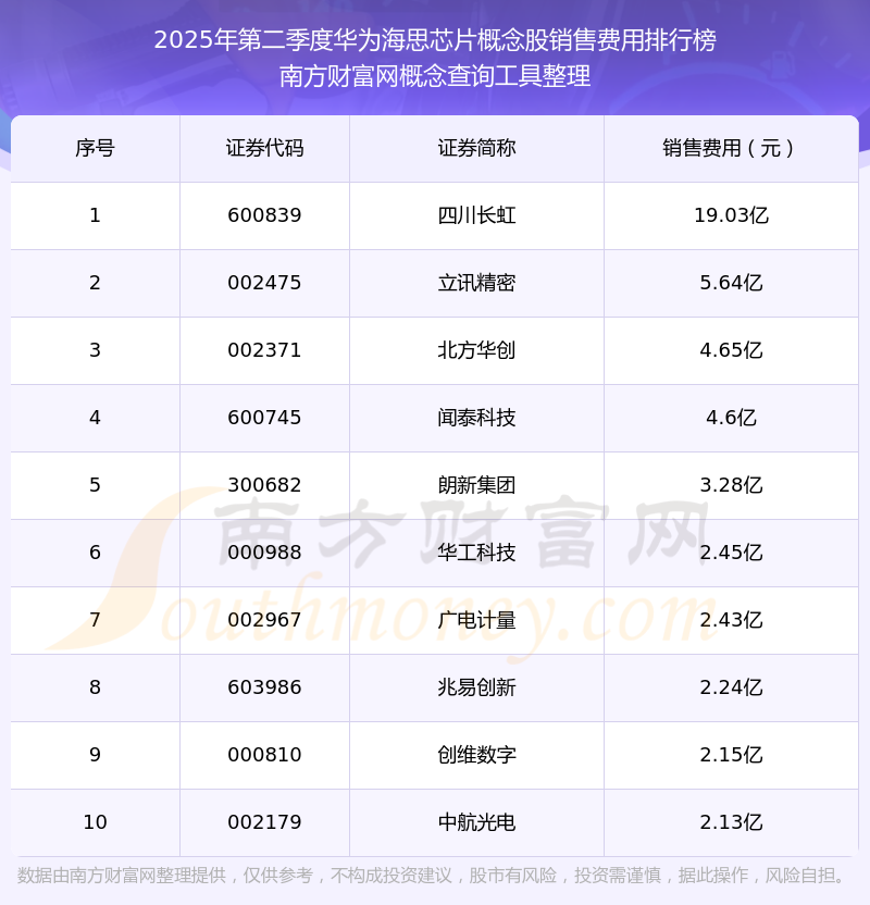 2025年第二季度,華為海思芯片概念股銷售費(fèi)用排行榜如下:四川長虹(600839)的銷售費(fèi)用總額高達(dá)19.03億,立訊精密(002475)和北方華創(chuàng)(002371)分別位居第二和第三,聞泰科技(600745)、朗新集團(tuán)(300682)、華工科技(000988)、廣電計(jì)量(002967)、兆易創(chuàng)新(603986)、創(chuàng)維數(shù)字(000810)、中航光電(002179)分別進(jìn)入前十,其銷售費(fèi)用總額分別排名第4-10名。