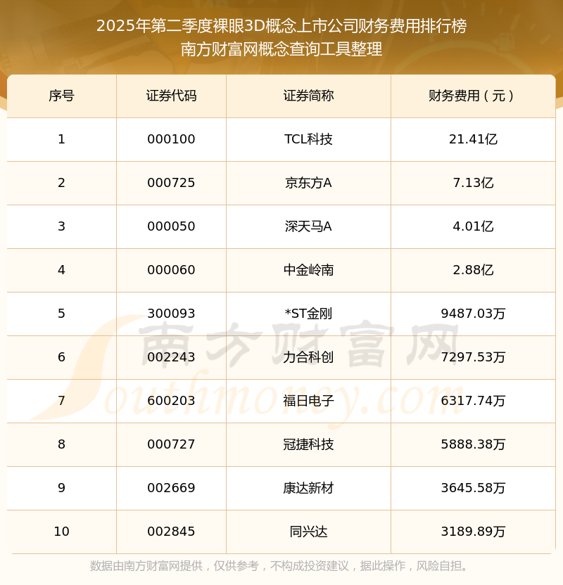 2025年第二季度,裸眼3D概念上市公司財(cái)務(wù)費(fèi)用排名如下:TCL科技(000100)的財(cái)務(wù)費(fèi)用總額高達(dá)21.41億,京東方A(000725)和深天馬A(000050)分別位居第二和第三,中金嶺南(000060)、*ST金剛(300093)、力合科創(chuàng)(002243)、福日電子(600203)、冠捷科技(000727)、康達(dá)新材(002669)、同興達(dá)(002845)分別進(jìn)入前十,其財(cái)務(wù)費(fèi)用總額分別排名第4-10名。
