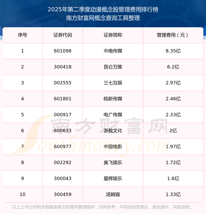 2025年第二季度,動漫概念股管理費用排名中,中南傳媒(601098)的管理費用總額高達8.35億,昆侖萬維(300418)和三七互娛(002555)排名第二和第三,皖新傳媒(601801)、電廣傳媒(000917)、浙數(shù)文化(600633)、中國電影(600977)、奧飛娛樂(002292)、星輝娛樂(300043)、湯姆貓(300459)進入前十,其管理費用總額分別排名第4-10名。