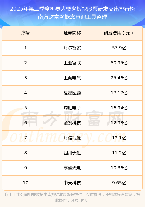2025年第二季度,機器人概念板塊股票研發(fā)支出排名如下:海爾智家(600690)研發(fā)支出總額高達57.9億,工業(yè)富聯(lián)(601138)和上海電氣(601727)分別位居第二和第三,復(fù)星醫(yī)藥(600196)、均勝電子(600699)、金發(fā)科技(600143)、海信視像(600060)、四川長虹(600839)、亨通光電(600487)、中天科技(600522)分別進入前十,其研發(fā)支出總額分別排名第4-10名。