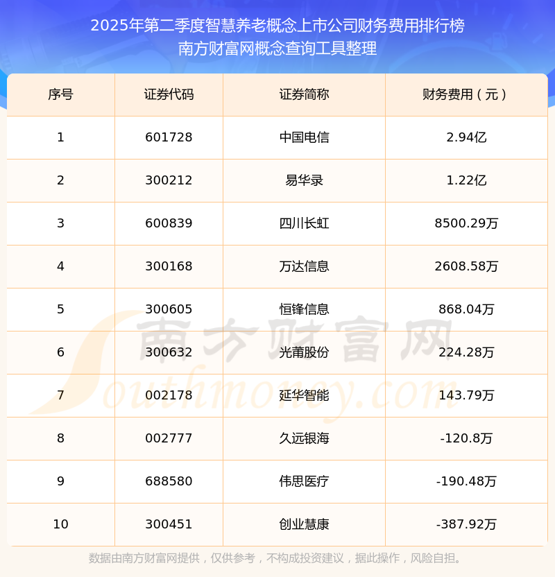 2025年第二季度,智慧養(yǎng)老概念上市公司財務(wù)費用排名如下:中國電信(601728)的財務(wù)費用總額高達2.94億,易華錄(300212)和四川長虹(600839)分別位居第二和第三,萬達信息(300168)、恒鋒信息(300605)、光莆股份(300632)、延華智能(002178)、久遠(yuǎn)銀海(002777)、偉思醫(yī)療(688580)、創(chuàng)業(yè)慧康(300451)分別進入前十,其財務(wù)費用總額分別排名第4-10名。