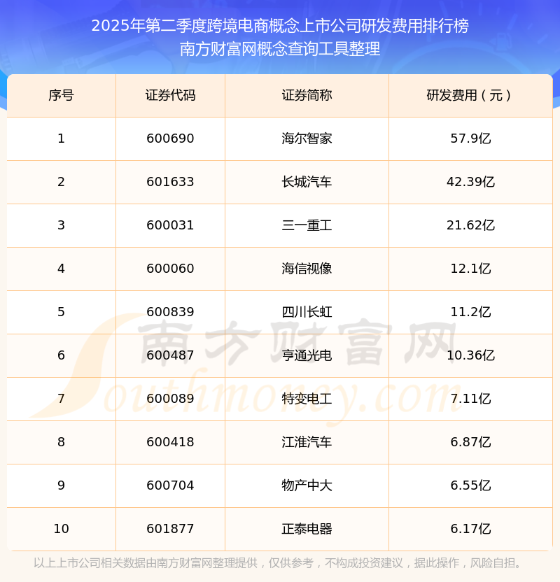 2025年第二季度,跨境電商概念上市公司研發(fā)費(fèi)用排行榜中,海爾智家(600690)研發(fā)費(fèi)用總額高達(dá)57.9億,長(zhǎng)城汽車(chē)(601633)和三一重工(600031)排名第二和第三,海信視像(600060)、四川長(zhǎng)虹(600839)、亨通光電(600487)、特變電工(600089)、江淮汽車(chē)(600418)、物產(chǎn)中大(600704)、正泰電器(601877)進(jìn)入前十,研發(fā)費(fèi)用總額分別排名第4-10名。