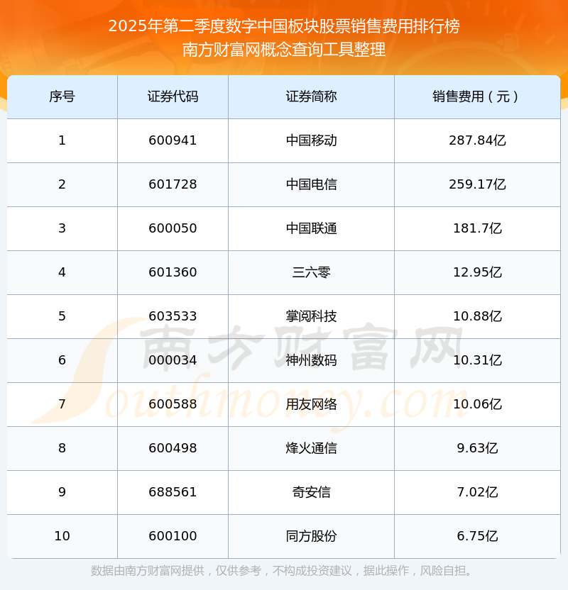 2025年第二季度,數(shù)字中國(guó)板塊股票銷售費(fèi)用排名中,中國(guó)移動(dòng)(600941)銷售費(fèi)用總額高達(dá)287.84億,中國(guó)電信(601728)和中國(guó)聯(lián)通(600050)排名第二和第三,三六零(601360)、掌閱科技(603533)、神州數(shù)碼(000034)、用友網(wǎng)絡(luò)(600588)、烽火通信(600498)、奇安信(688561)、同方股份(600100)進(jìn)入前十,銷售費(fèi)用總額分別排名第4-10名。