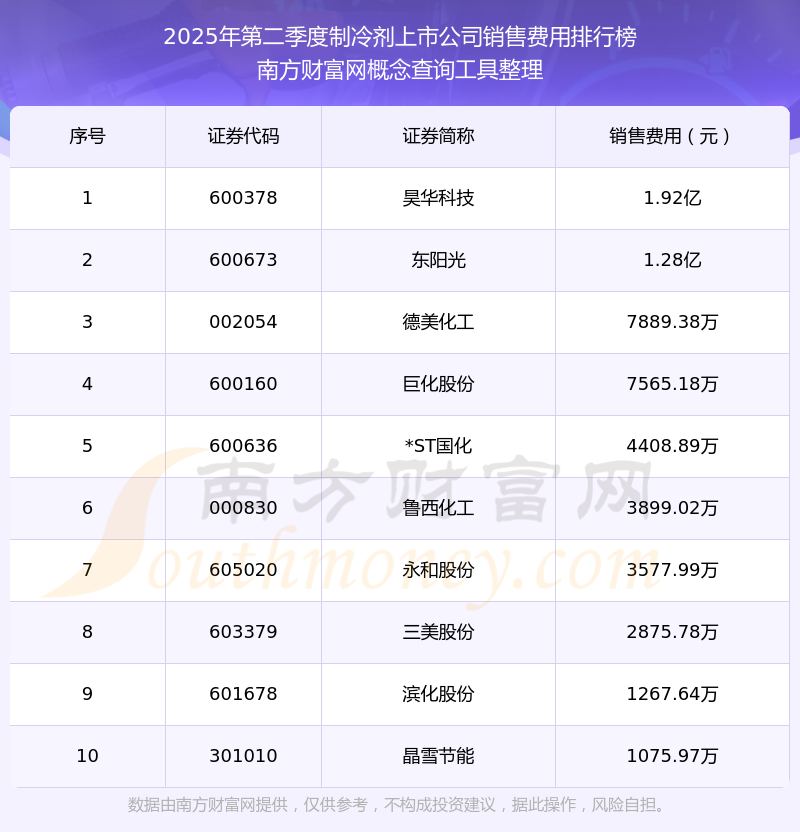 2025年第二季度,制冷劑上市公司銷售費(fèi)用排行榜中,昊華科技(600378)銷售費(fèi)用總額高達(dá)1.92億,東陽光(600673)和德美化工(002054)位居第二和第三,巨化股份(600160)、*ST國化(600636)、魯西化工(000830)、永和股份(605020)、三美股份(603379)、濱化股份(601678)、晶雪節(jié)能(301010)進(jìn)入前十,銷售費(fèi)用總額分別排名第4-10名。