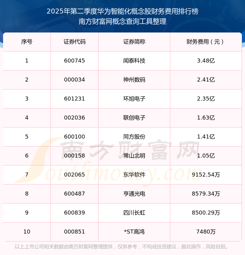 2025年第二季度,華為智能化概念股財務(wù)費用排行榜中,聞泰科技(600745)財務(wù)費用總額高達(dá)3.48億,神州數(shù)碼(000034)和環(huán)旭電子(601231)位居第二和第三,聯(lián)創(chuàng)電子(002036)、同方股份(600100)、常山北明(000158)、東華軟件(002065)、亨通光電(600487)、四川長虹(600839)、*ST高鴻(000851)進(jìn)入前十,財務(wù)費用總額分別排名第4-10名。