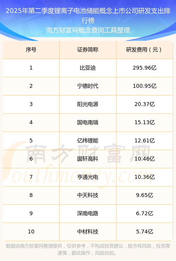 2025年第二季度,鋰離子電池儲能概念上市公司研發(fā)支出排行榜中,比亞迪(002594)研發(fā)支出總額高達295.96億,寧德時代(300750)和陽光電源(300274)位居第二和第三,國電南瑞(600406)、億緯鋰能(300014)、國軒高科(002074)、亨通光電(600487)、中天科技(600522)、深南電路(002916)、中材科技(002080)進入前十,研發(fā)支出總額分別排名第4-10名。
