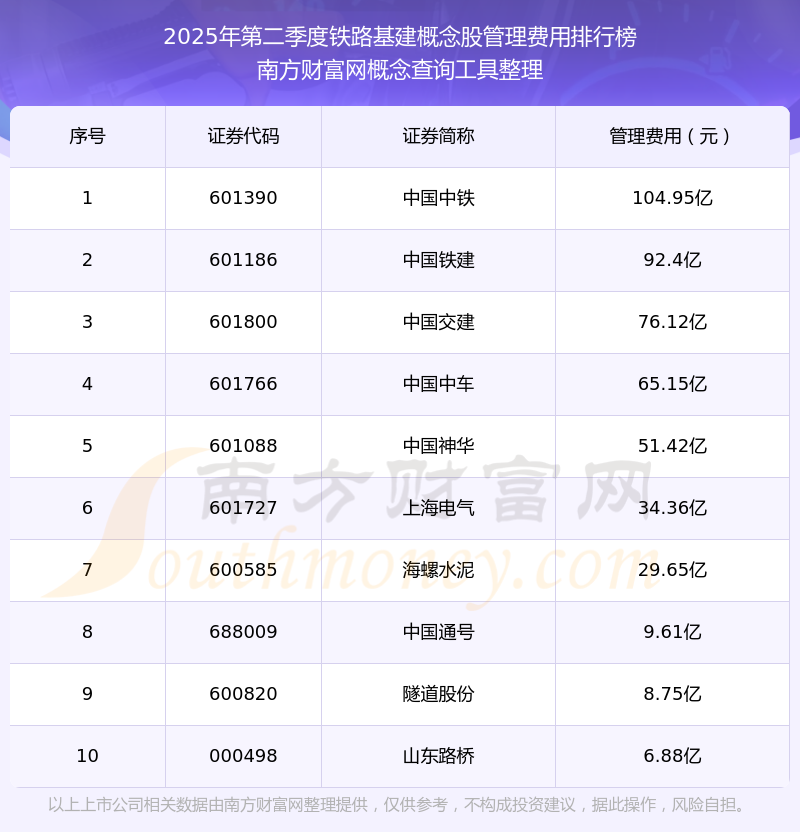 2025年第二季度,鐵路基建概念股管理費用排名中,中國中鐵(601390)的管理費用總額高達104.95億,中國鐵建(601186)和中國交建(601800)排名第二和第三,中國中車(601766)、中國神華(601088)、上海電氣(601727)、海螺水泥(600585)、中國通號(688009)、隧道股份(600820)、山東路橋(000498)進入前十,其管理費用總額分別排名第4-10名。