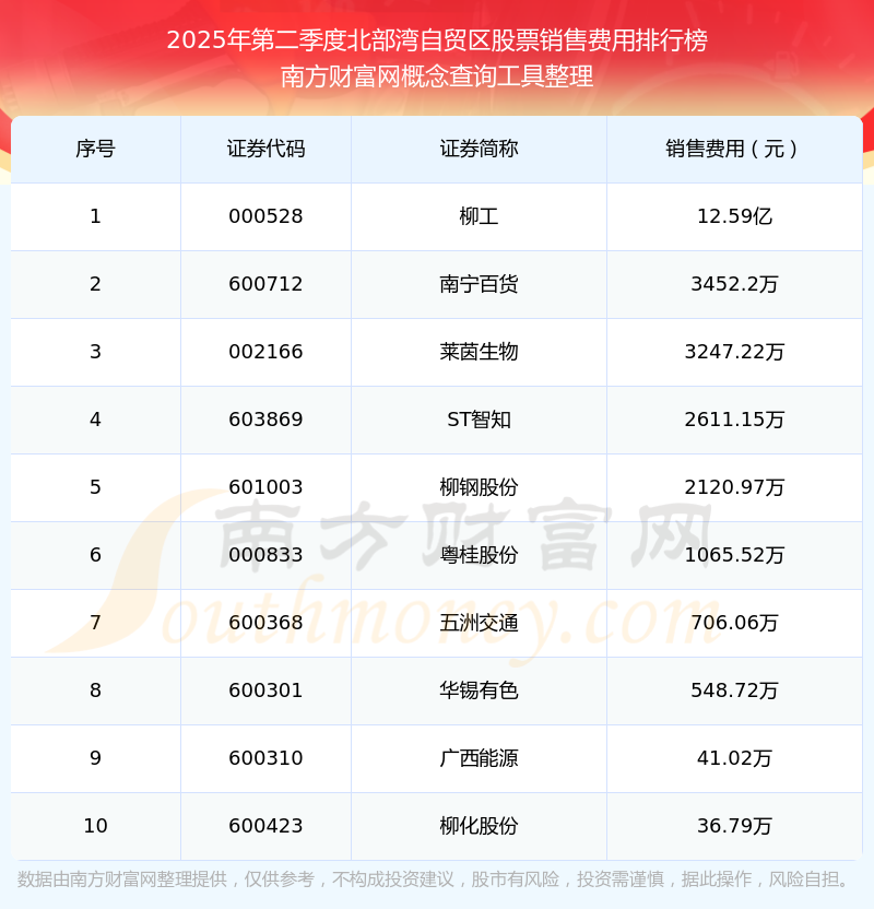 2025年第二季度,北部灣自貿(mào)區(qū)股票銷售費(fèi)用排行榜如下:柳工(000528)的銷售費(fèi)用總額高達(dá)12.59億,南寧百貨(600712)和萊茵生物(002166)分別位居第二和第三,ST智知(603869)、柳鋼股份(601003)、粵桂股份(000833)、五洲交通(600368)、華錫有色(600301)、廣西能源(600310)、柳化股份(600423)分別進(jìn)入前十,其銷售費(fèi)用總額分別排名第4-10名。