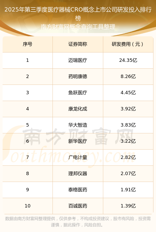 2025年第三季度,醫(yī)療器械CRO概念上市公司研發(fā)投入排行榜中,邁瑞醫(yī)療(300760)研發(fā)投入總額高達(dá)24.35億,藥明康德(603259)和魚躍醫(yī)療(002223)位居第二和第三,康龍化成(300759)、華大智造(688114)、新華醫(yī)療(600587)、廣電計量(002967)、理邦儀器(300206)、泰格醫(yī)藥(300347)、百誠醫(yī)藥(301096)進(jìn)入前十,研發(fā)投入總額分別排名第4-10名。