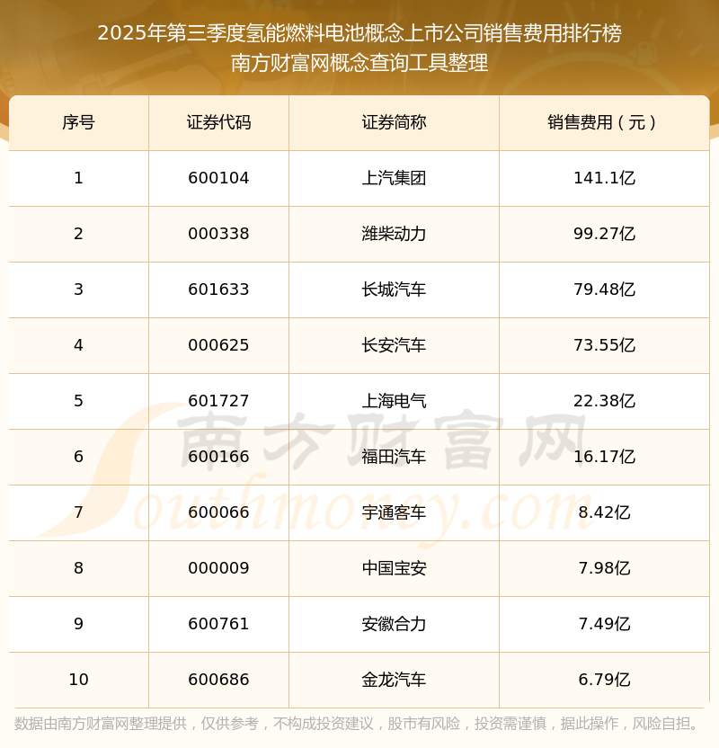 2025年第三季度,氫能燃料電池概念上市公司銷售費用排名中,上汽集團(600104)銷售費用總額高達141.1億,濰柴動力(000338)和長城汽車(601633)排名第二和第三,長安汽車(000625)、上海電氣(601727)、福田汽車(600166)、宇通客車(600066)、中國寶安(000009)、安徽合力(600761)、金龍汽車(600686)進入前十,銷售費用總額分別排名第4-10名。