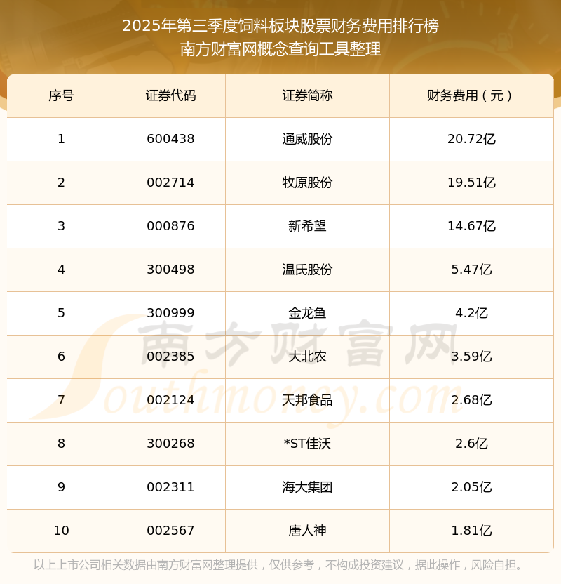 2025年第三季度,飼料板塊股票財務費用排名如下:通威股份(600438)的財務費用總額高達20.72億,牧原股份(002714)和新希望(000876)分別位居第二和第三,溫氏股份(300498)、金龍魚(300999)、大北農(nóng)(002385)、天邦食品(002124)、*ST佳沃(300268)、海大集團(002311)、唐人神(002567)分別進入前十,其財務費用總額分別排名第4-10名。