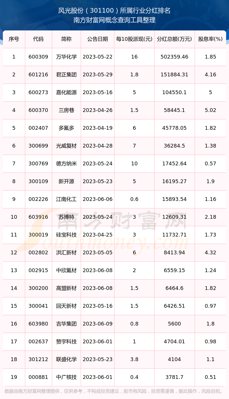 按照南方財富網趨勢選股系統(tǒng)統(tǒng)計,風光股份所屬行業(yè)為化學制品行業(yè),化學制品行業(yè)分紅排名情況如下表: