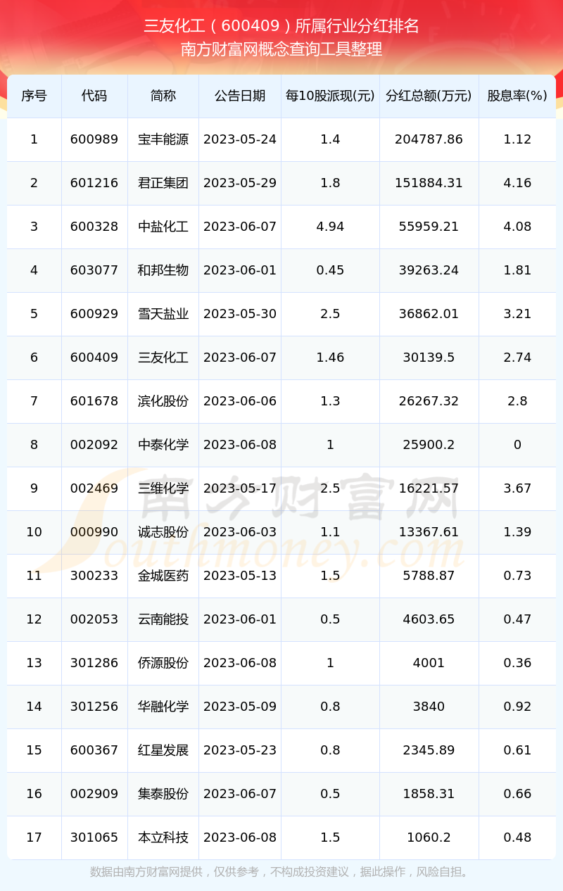 按照南方財富網(wǎng)趨勢選股系統(tǒng)統(tǒng)計,三友化工所屬行業(yè)為粘膠短纖行業(yè),粘膠短纖行業(yè)分紅排名情況如下表: