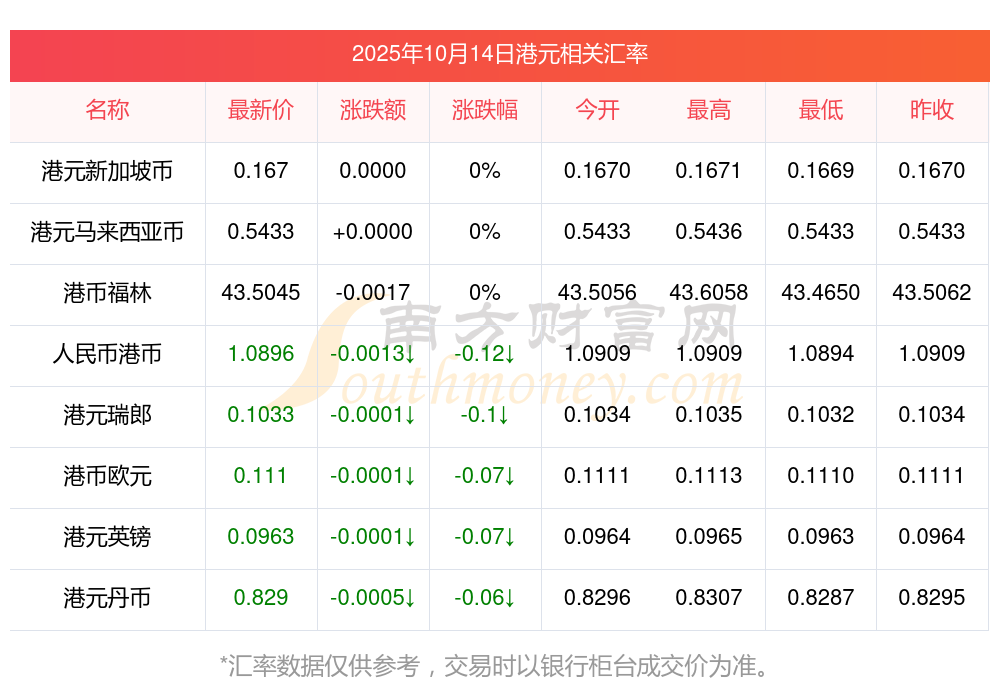 根據(jù)2025年10月14日匯率計算,港元兌換克朗匯率最新價2.698700,今開價2.7002,昨收價2.7002,最高價2.7089,最低價2.6967。