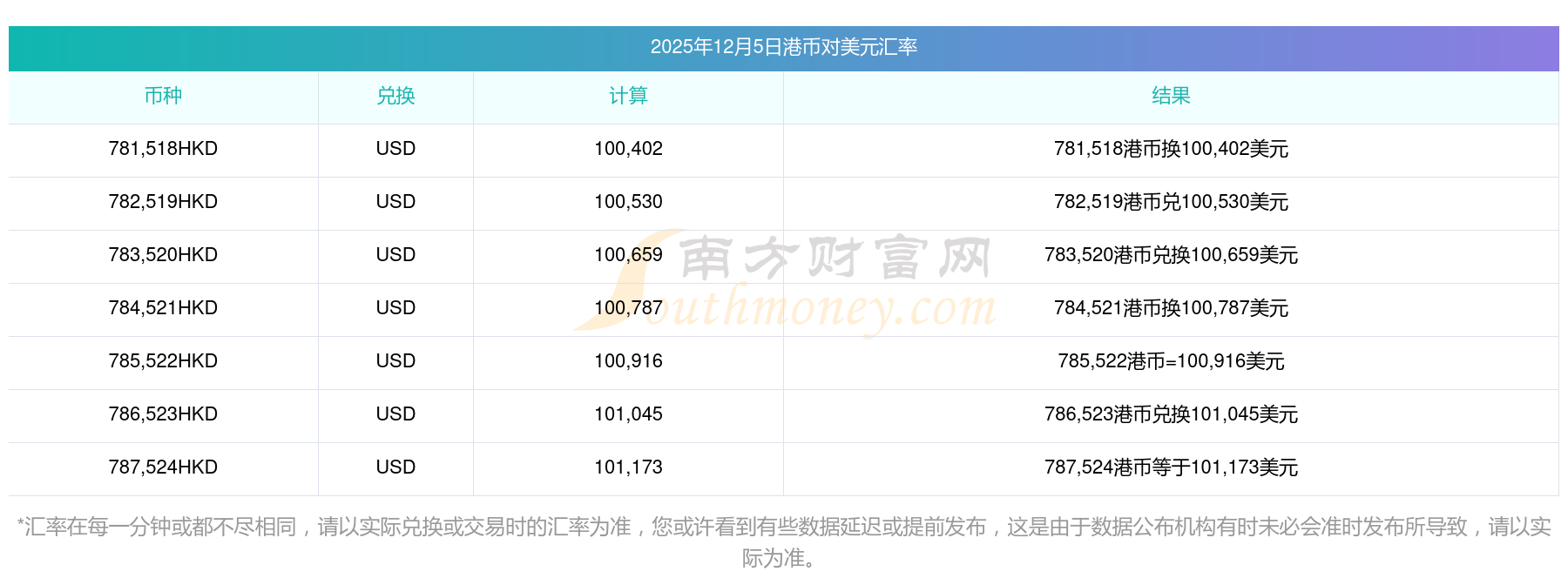 2025年12月5日匯率行情:4港幣對美元匯率多少
