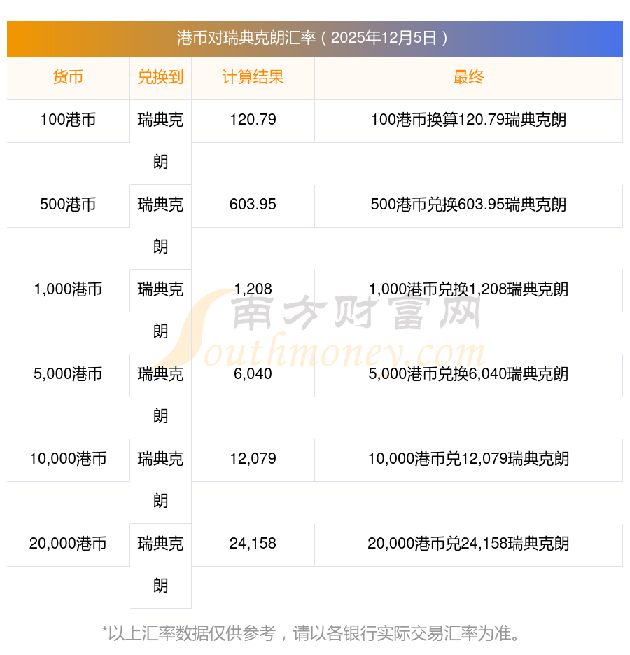 匯率計算:40港幣兌換瑞典克朗匯率多少? 12月5日