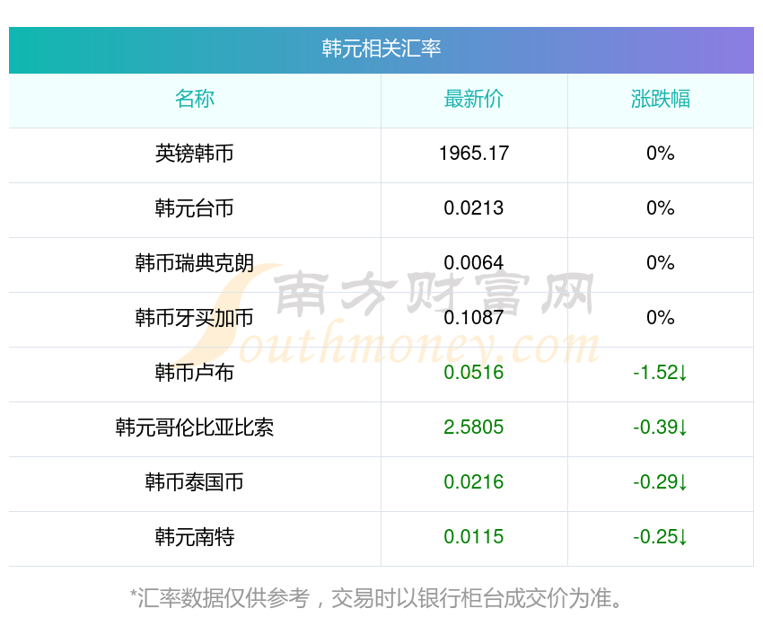 2025年12月5日最新消息,韓元兌換美元最新匯率為0.000679,今開為0.0007,昨收為0.0007,最高為0.0007,最低為0.0007。