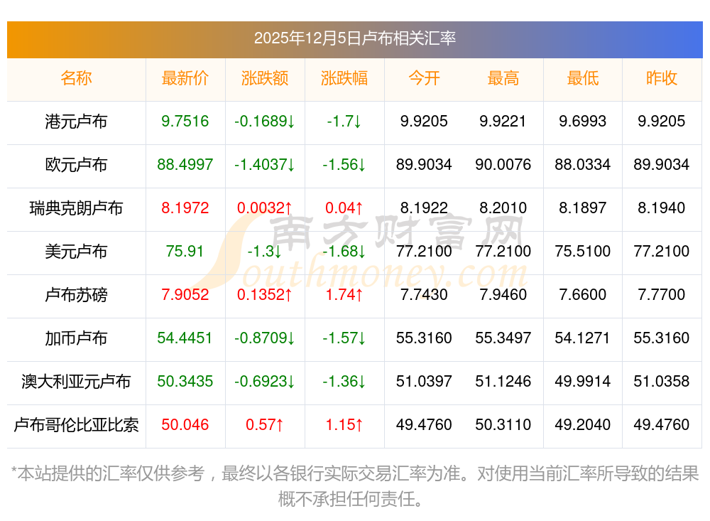 根據(jù)2025年12月5日匯率計算,RUB兌換THB匯率最新價0.419700:今開價0.4145,昨收價0.4145,最高價0.4223,最低價0.4128。