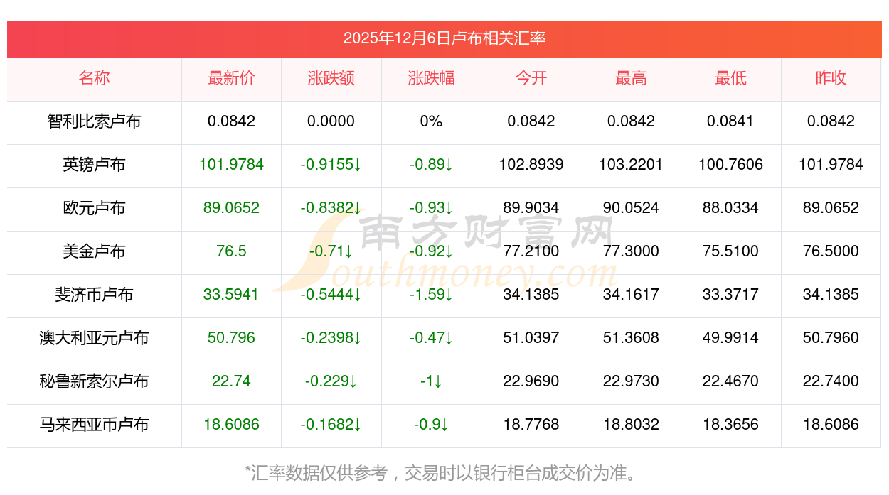 2025年12月6日盧布相關(guān)匯率查詢(xún)