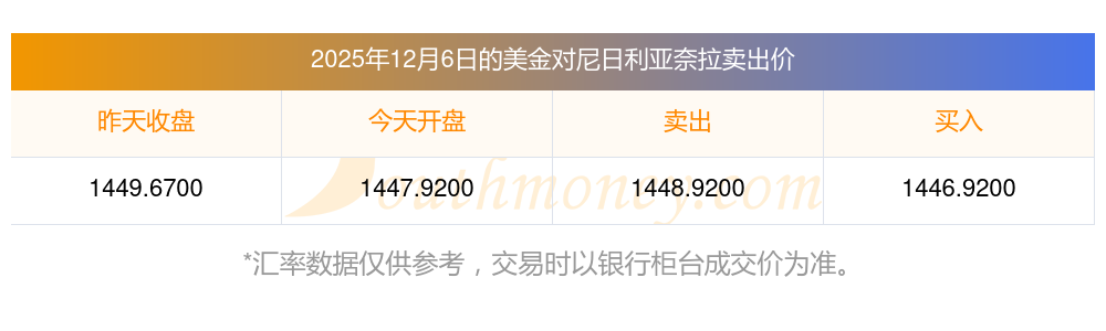 2025年12月6日美金與尼日利亞奈拉的兌換匯率計算如下: