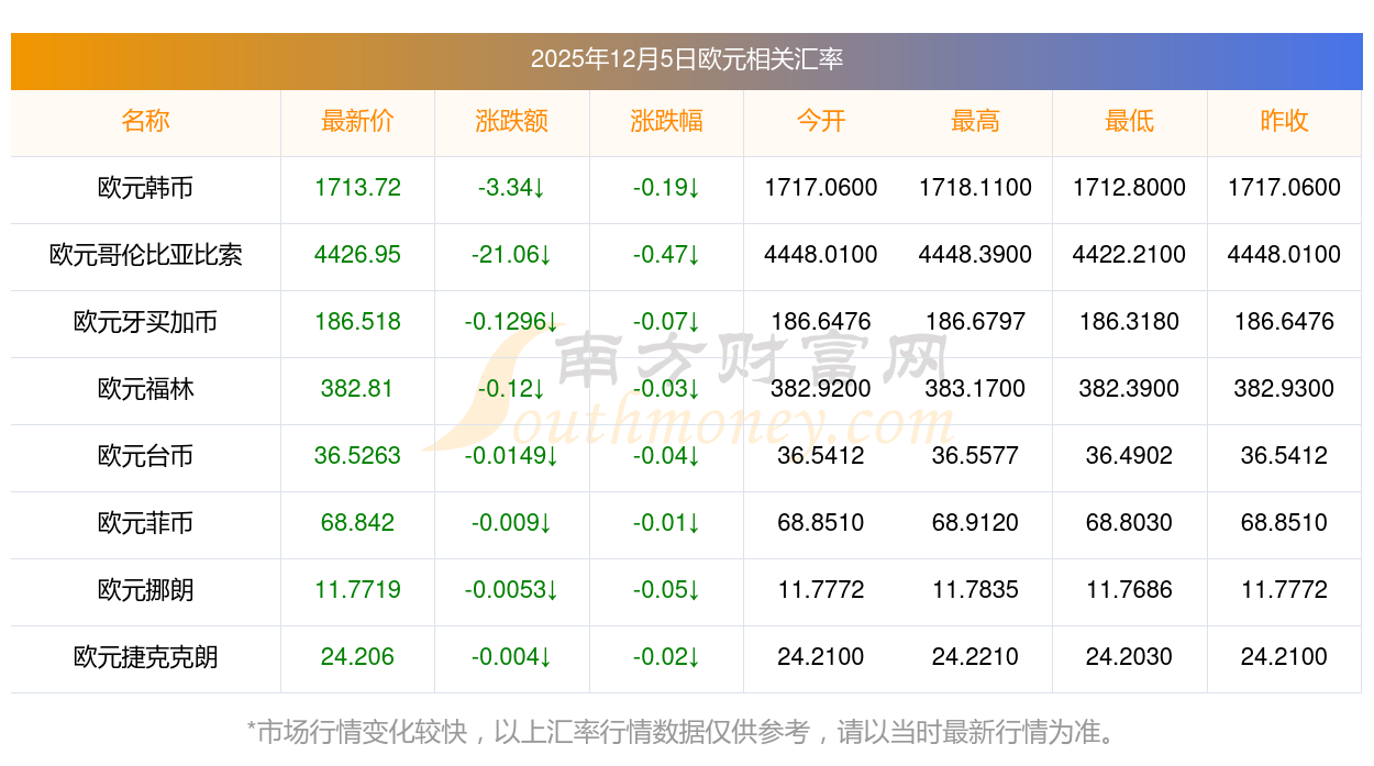 根據(jù)2025年12月5日匯率,歐元兌換澳元匯率最新價1.761100,今開價1.7616,昨收價1.7616,最高價1.7631,最低價1.7607。