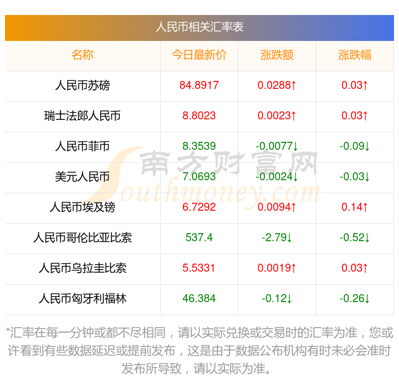 匯率在每一分鐘或都不盡相同,請以實際兌換或交易時的匯率為準,您或許看到有些數(shù)據(jù)延遲或提前發(fā)布,這是由于數(shù)據(jù)公布機構有時未必會準時發(fā)布所導致,請以實際為準。
