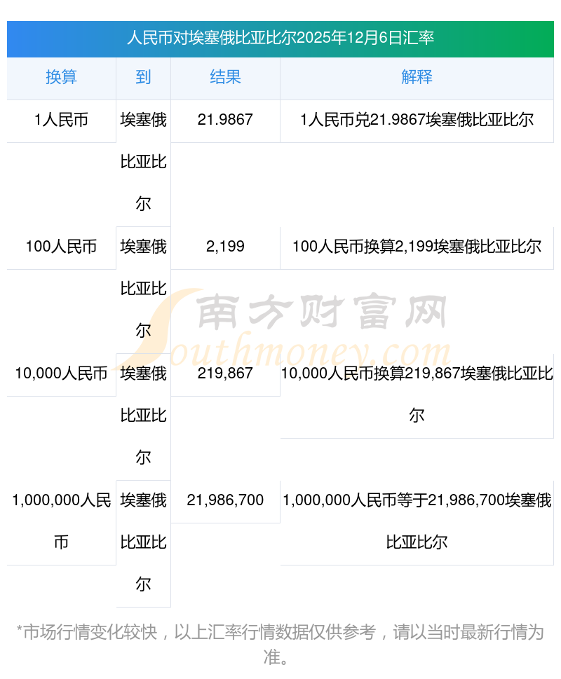 2025年12月6日人民幣兌換埃塞俄比亞比爾匯率是:21.9867