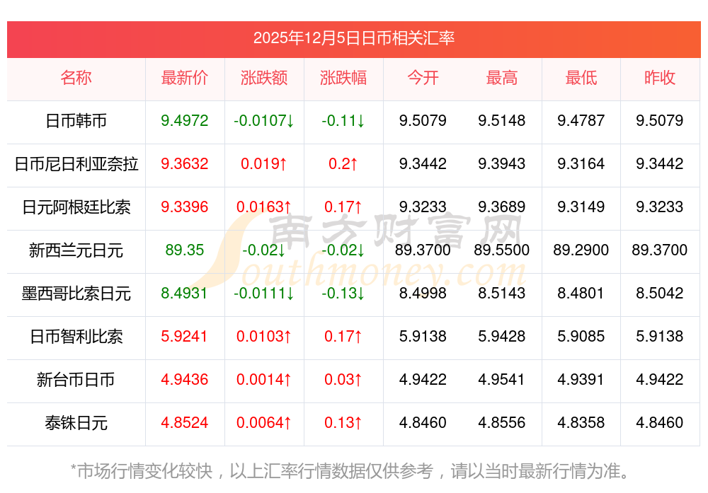 根據(jù)2025年12月5日匯率,日幣兌換港幣匯率最新價0.050291,今開價0.0502,昨收價0.0502,最高價0.0504,最低價0.0501。