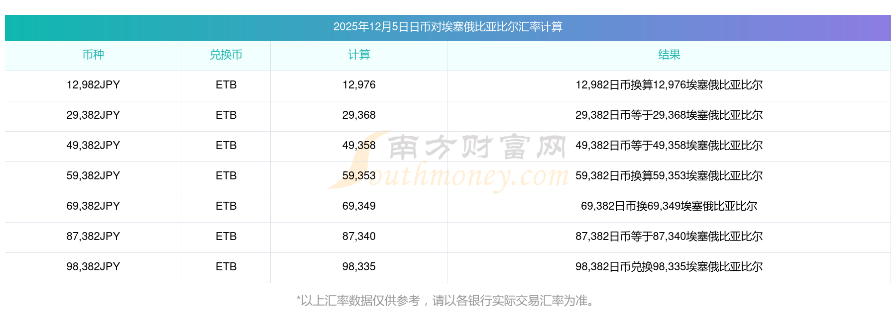 2025年12月5日埃塞俄比亞比爾對日幣的匯率為:1.00048